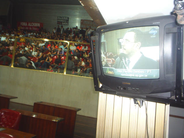 48-Deputado Campos Machado usando o tempo de outro Deputado retorno a Tribuna para mais discurso. Durante o seu discurso alunos fazem trenzinho, andando de um lado para o outro da galeria |