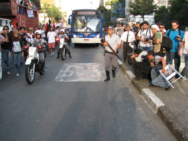 37-Policial com espingarda de bala de borracha acompanha passeata |