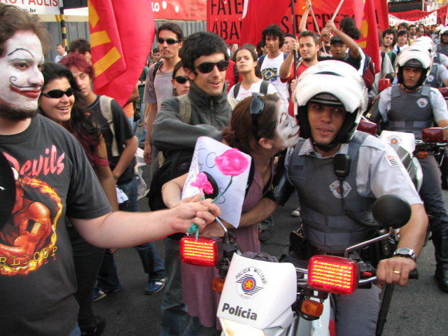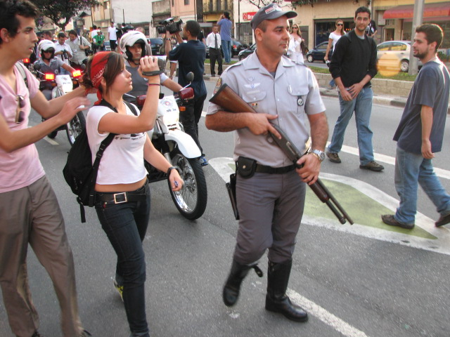48-Policial com espingarda de bala de borracha acompanha passeata |