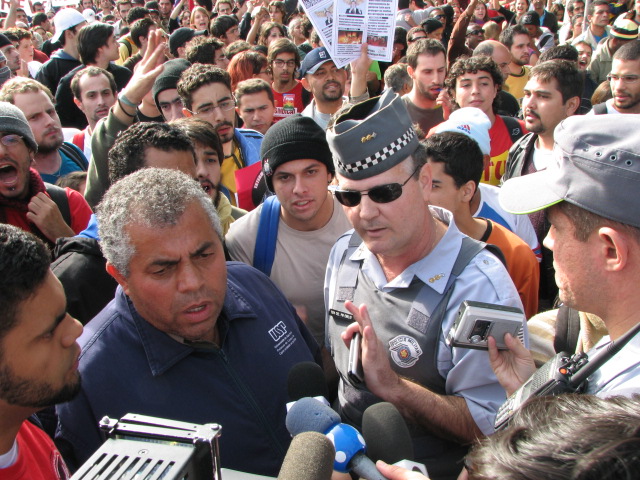 34-Membro do Sintusp conversando com a Polícia Militar para que liberem a rua para que os alunos, servidores e professores possam se aproximar do Palácio dos Bandeirantes |