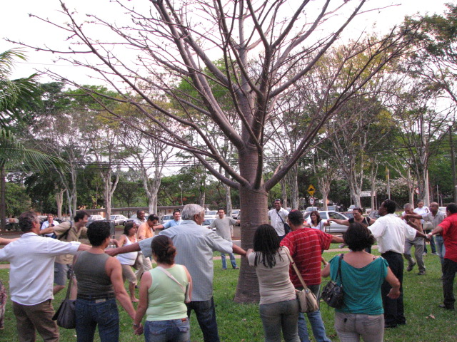 46-Servidores de mãos dadas em volta de uma árvore africana plantada próximo ao prédio da Reitoria da Unicamp |