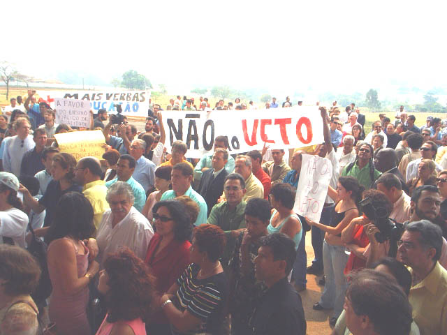 56-No local da cerimônia alunos levantam seus cartazes e faixas |