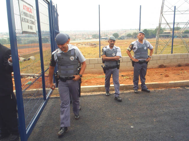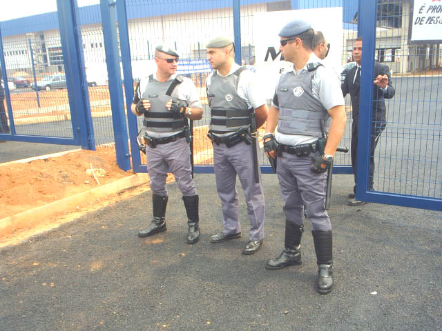 37-Polícia Militar é informada da chegada da comitiva e se posiciona na frente do portão da fábrica |