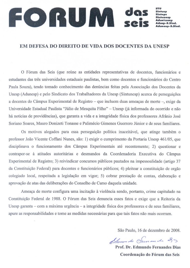 Não é de hoje que os movimentos sociais têm sido alvos de ataques daqueles que entendem democracia apenas como SEU legítimo poder de fazer e desfazer. Várias foram as denúncias de perseguições políticas como a demissão de Dirceu Travesso e a invasão à reunião da Conlutas em São José dos Campos, agora essas perseguições se processam no interior da Universidade Pública pondo em risco sua missão de espaço livre de debates. Dentro das universidades estaduais paulistas a situação não é muito diferente, estava apenas mais velada. Mas neste final de ano isto mudou. Fomos surpreendidos por uma série de incidentes que nos fazem pensar: até onde pode ir a tirania das administrações das universidades estaduais paulistas? Após anos de perseguições políticas por parte da coordenadoria executiva do campus de Registro da UNESP, os professores Mauro Donizeti Tonasse, Palimécio Gimenes Guerrero Júnior, Afrânio José Soriano Soares e João Vicente Coffani Nunes, companheiros da Adunesp, receberam novas ameaças de morte. As primeiras denúncias foram levadas à Reitoria da Unesp que nada fez para reverter este processo de banditismo que se instaurou sobre o campus de Registro, no qual a administração local leva ao pé da letra o título de EXPERIMENTAL que o campus carrega utilizando práticas poucos usuais em tempos de democracia. Comunicada pela Adunesp, Sintunesp e Fórum das Seis a UNESP abriu, contudo , processo de sindicância contra... as vítimas. Mas, afinal, o que fizeram estes professores para receber não uma, mas duas vezes ameaças de morte por telefone e e-mail, para terem suas casas pichadas, para serem vítimas de atitudes violentas e covardes? Eles apenas requereram que a lei fosse respeitada pela Coordenadoria do Campus sobre a qual incidem denúncias várias de autoritarismo e desmandos. Segundo o documento enviado pela Adunesp para o Fórum das Seis (em anexo) os referidos professores estão sendo perseguidos por: “(I) exigir o cumprimento da Portaria UNESP 461/05; (II) questionar e contrapor-se às atitudes autoritárias e aos desmandos da coordenadoria executiva do campus; (III) reivindicar concursos públicos para docentes e funcionários, pautados na impessoalidade pública; (IV) pleitear a constituição de órgão colegiado local, respeitada a legislação em vigor; (V) cobrar prestação de contas, elaboração e aprovação de atas das deliberações do Conselho de Curso dessa unidade, entre outros”. Se a situação no movimento sindical já estava tensa, e muito, devido ao relatado até agora ela piorou após a demissão de Claudionor Brandão, funcionário da USP e dirigente do Sintusp há mais de 20 anos. No dia 9 de dezembro de 2008, pouco tempo depois de cumprir suspensão de 15 dias por ter participado de um ato contra os Decretos do governador José Serra em 2007, Brandão recebeu sua carta de demissão. A justificativa da Reitoria da Usp para tal atitude foi a finalização de um outro processo administrativo que vinha se prolongando desde 2005 e que teve seu parecer final elaborado agora. Brandão não é só um funcionário da Usp, é um dirigente sindical com uma imensa história de defesa dos trabalhadores, mas também da universidade como um todo. Sua demissão, neste momento, quando a universidade está esvaziada por conta das férias de final de ano demonstra a maneira insidiosa como a Reitora da Usp quer conduzir este jogo. E não apenas sobre os funcionários, mas também sobre lideranças estudantis.