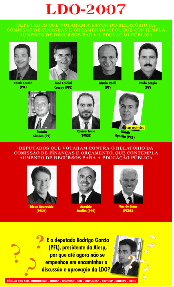 Vejam os Deputados que fazem parte da Comissão de Finanças e Orçamento do Estado de São Paulo, que votaram contra o Relatório da LDO-2007, que permite mais verbas para a Educação. Adunicamp |