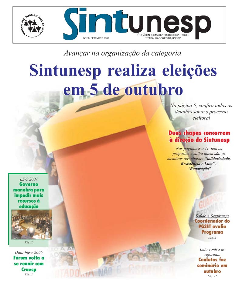 Eleição Sintunesp. Chapa Solidariedade, Resistência e Luta, que concorrerá a Direção do Sintunesp, na eleição do próximo dia 05/10/2006, divulga nomes que compõe a chapa e propostas. Chapa Solidariedade, Resistência e Luta |