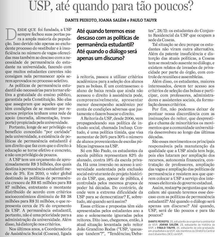 USP, até quando para tão poucos? Até quando teremos esse descaso com as políticas de permanência estudantil? Até quando o diálogo será apenas um discurso? Dante Peixoto, Aline Salém e Paulo Tauyr, membros do DCE da USP Folha de São Paulo |
