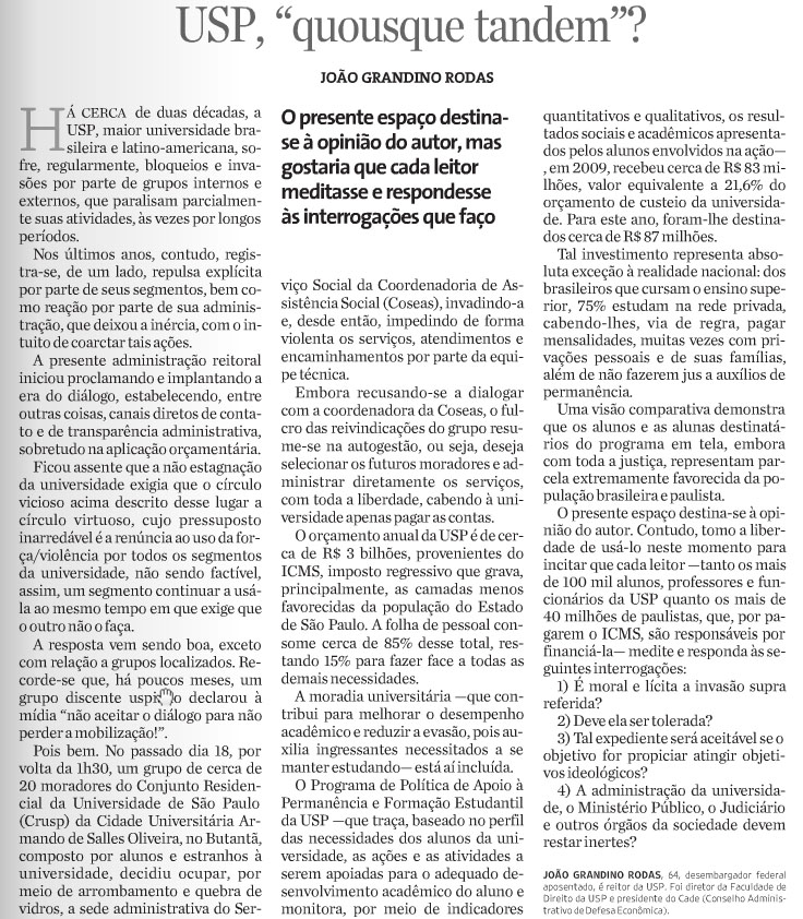 USP, "Quousque Tandem"? João Grandino Rodas, Reitor da USP Folha de São Paulo |