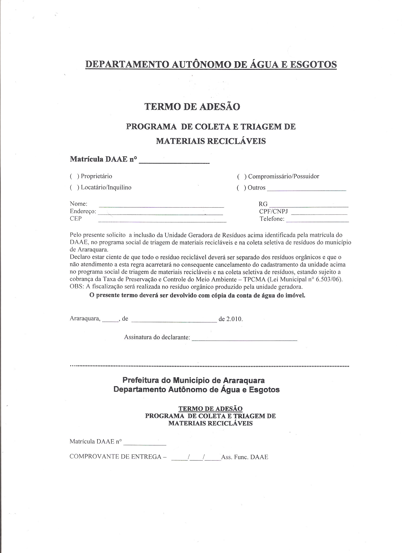 Glaucia, servidora da Biblioteca, Faculdade de Ciências e Letras, Campus de Araraquara, encaminha para divulgação formulário referente a Termo de Adesão Programa de Coleta e Triagem de Materiais Recicláveis na cidade de Araraquara. Texto - Formulário |