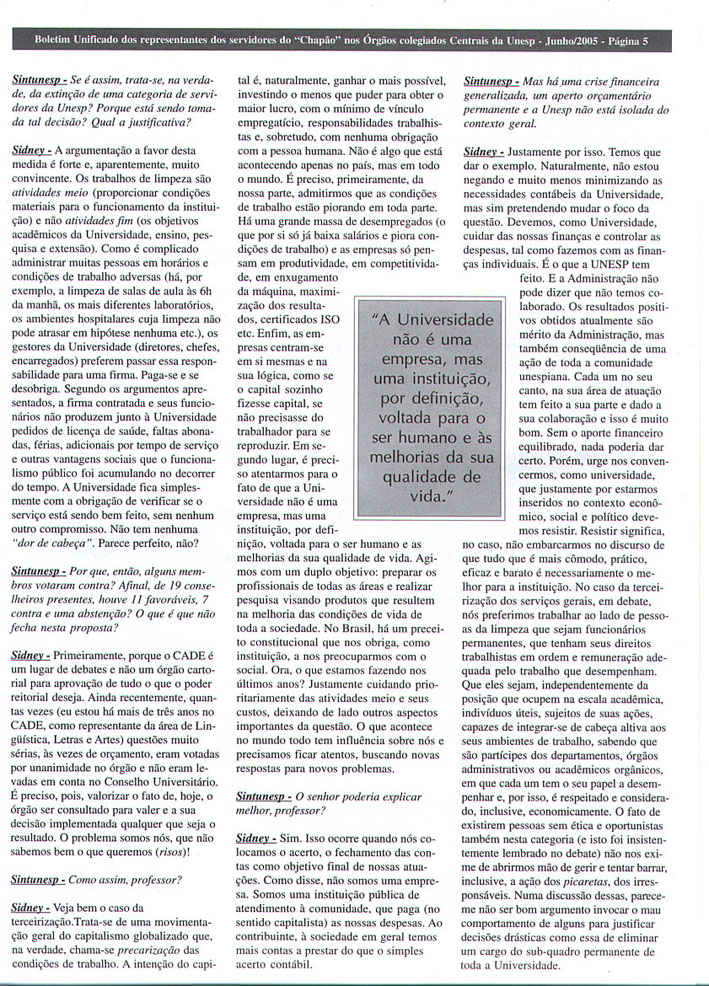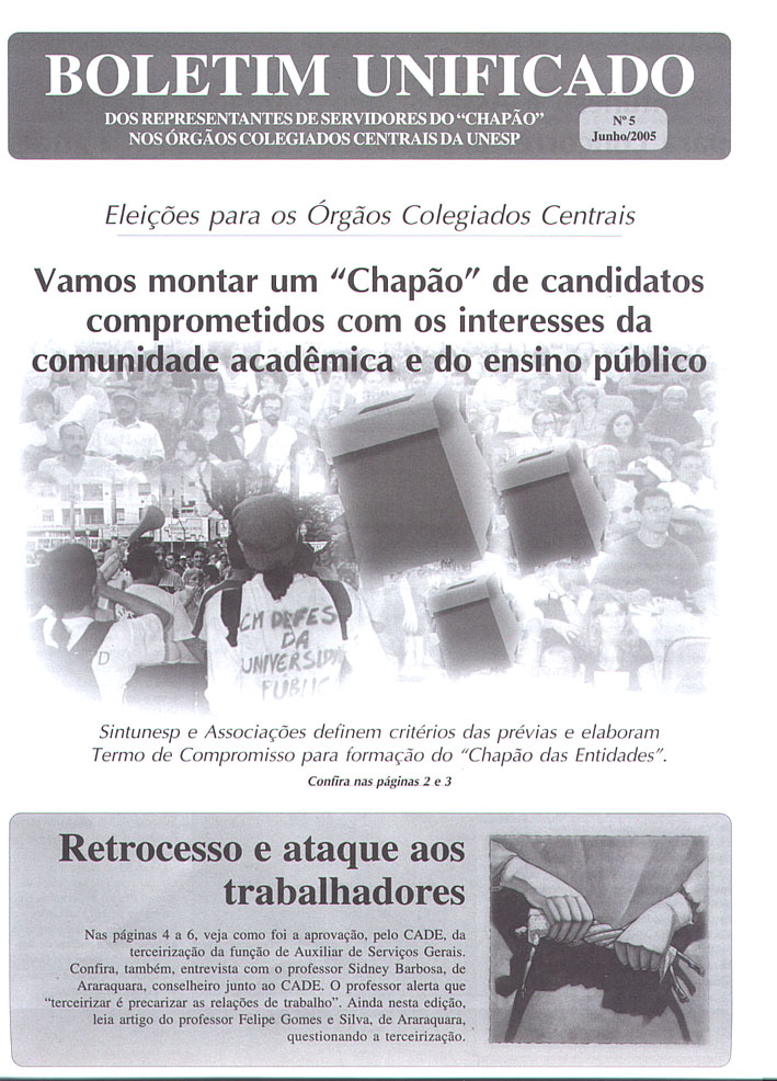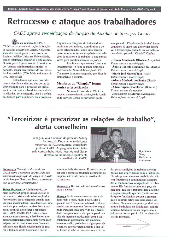 Terceirização - "Terceirizar é precarizar as relações de trabalho", alerta conselheiro, Professor Sidney Barbosa da Faculdade de Ciências e Letras do Câmpus de Araraquara e membro do CADE, votou contra a terceirização - Boletim Unificado Página 04 - 05 - 06 |