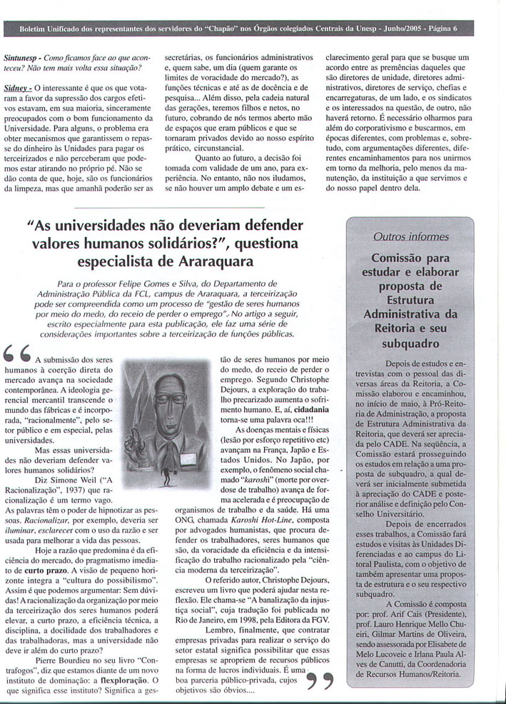 Terceirização - "As universidades não deveriam defender valores humanos solidários?", questiona o especialista Professor Felipe Gomes e Silva, da Faculdade de Ciências e Letras do Câmpus de Araraquara - Boletim Unificado Página 06 |