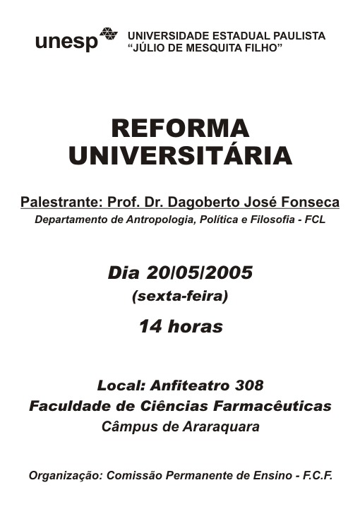 | Comissão Permanente de Ensino da Faculdade de Ciências Farmacêuticas, informa que hoje, 20/05/05, será realizada Palestra sobre Reforma Universitária. Convite |