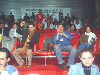 34-Após o Presidente da Assembléia Legislativa encerrar a sessão, membro do Fórum das Seis conversa com alunos e professores. |