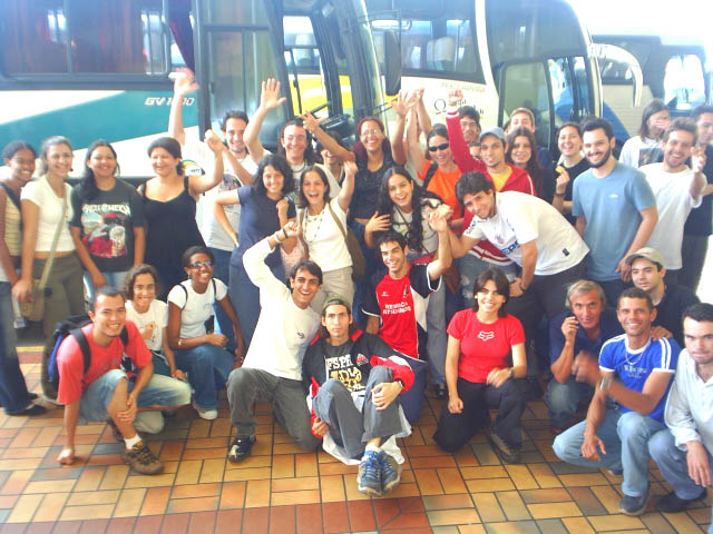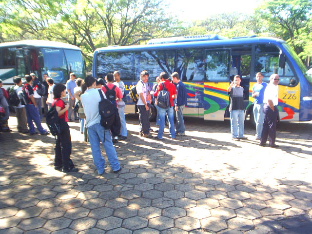 1-Alunos e servidores aguardando para embarcar no ônibus |