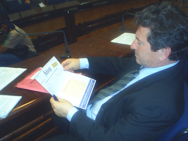 na reunião lendo o Boletim da Adusp. |