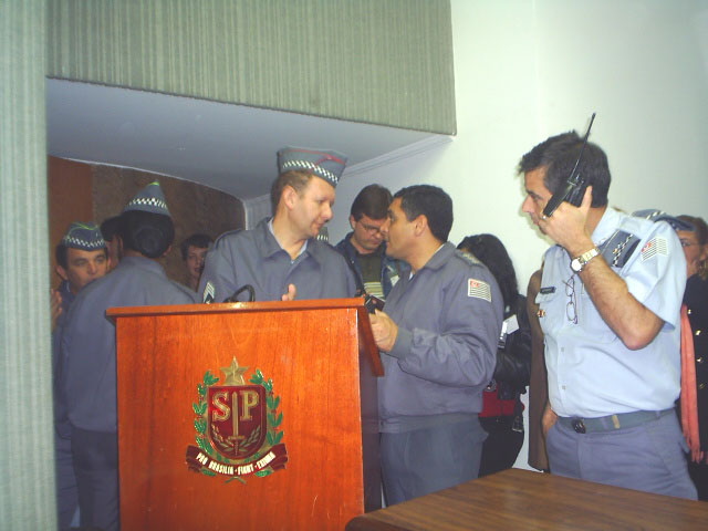 30-Devido a grande manifestação dos servidores e alunos durante a reunião da Comissão de Finanças e Orçamento, policiais militares preocupados conversam com seus colegas pelo rádio. |