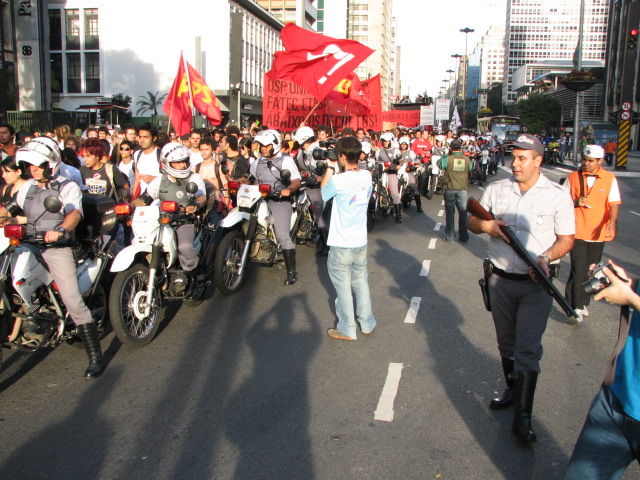 37-Policial com espingarda de bala de borracha acompanha passeata |