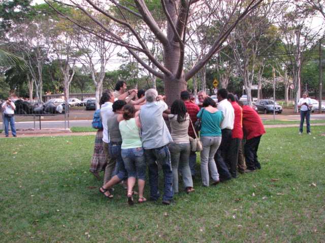 46-Servidores de mãos dadas em volta de uma árvore africana plantada próximo ao prédio da Reitoria da Unicamp |