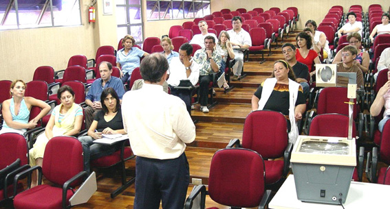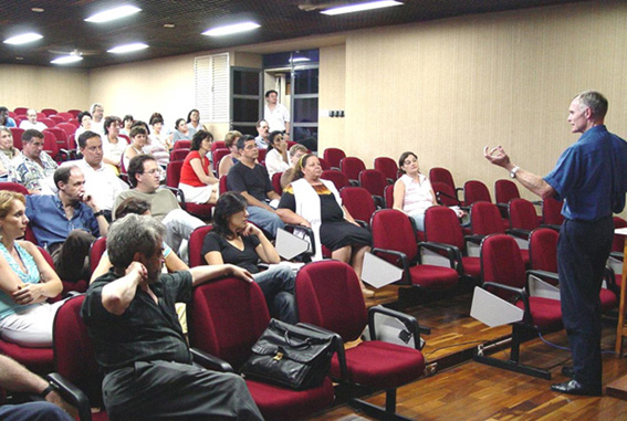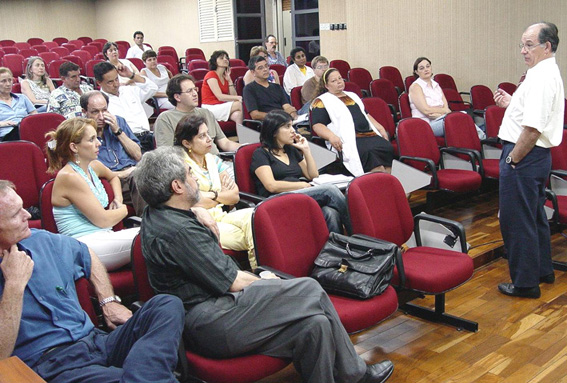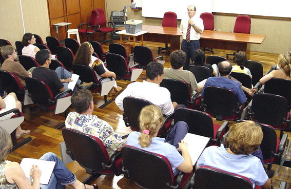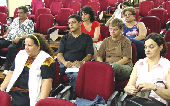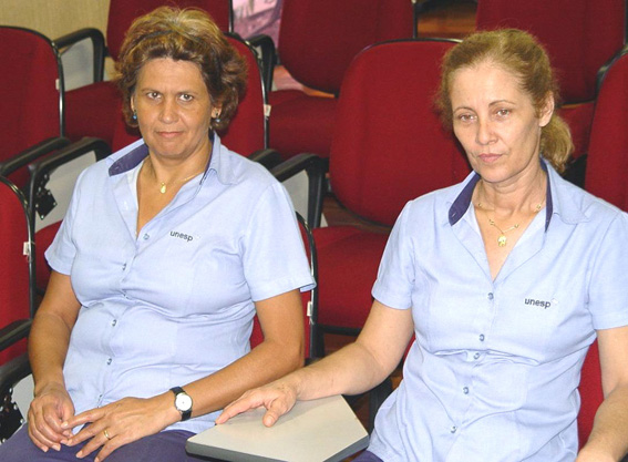 | 5-Prof. Dr. Marcos Macari, candidato a Reitor da Unesp, apresentando Plano de Gestão aos servidores | 6-Servidoras do Setor de Zeladoria presentes na apresentação do Plano de Gestão |