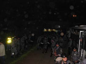 9-Alunos em fila e de braços dados caminham para os ônibus que os conduzirá até a Delegacia |