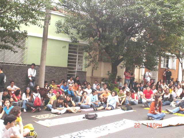 | 17-Alunos em passeata se dirigem até a Câmara Municipal para pedir apoio dos vereadores | 18-Na frente da Câmara Municipal alunos se sentam na rua aguardando serem recebidos pelo Presidente da Câmara |