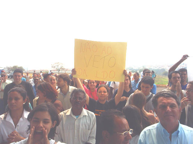 56-No local da cerimônia alunos levantam seus cartazes e faixas |
