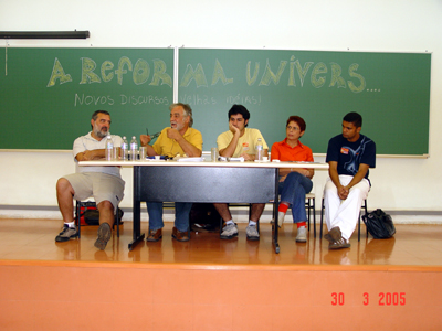 No dia 30 de março, aconteceu o debate “Reforma Universitária do governo Lula: Novos discursos, velhas idéias”, em um dos auditórios do PB da Unicamp. Tendo por debatedores Osvaldo Coggiola (vice-presidente do Andes-SN); José Arbex (professor da PUC-SP e editor da Caros Amigos) e José Júnior (representando a Conlute), o debate começou às 12h30, estendendo-se até às 15h00, com mais de 200 pessoas presentes, especialmente estudantes (da Unicamp, da PUCCamp, da Facamp). A participação do público foi bastante intensa, expressando diferentes posições e colocando várias questões.