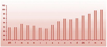 | Índice de arrecadação do ICMS* média móvel trimestral (até abr./2006**) - Indice base: abr.2006 = 100 |