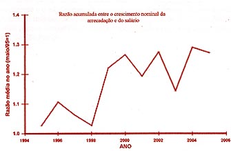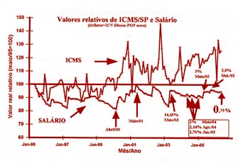 O desempenho da arrecadação do ICMS, por exemplo, pode ser observado no gráfico ao lado, elaborado pela Secretaria da Fazenda (Relatório da Receita Tributária – maio de 2006). Nele pode-se ver um crescimento real e consistente desde o segundo semestre do ano passado.