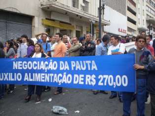 Agora é a hora de todas as unidades se mobilizarem. Sem mobilização, não tem auxílio alimentação. É fundamental comparecermos em grande número ao Ciclo Básico, a partir das 9h. (Foto: Nilvane Martins, durante participação dos trabalhadores da Unicamp na manifestação convocada pelo Fórum das Seis em 29/05/2008, diante da reitoria da Unesp, em São Paulo).